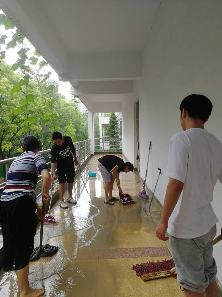 特大暴雨造成了教学楼积水。公司值班老师庞凯歌、杨瑞娟带领留校员工全力开展校园排险工作,不惧风雨,全面排查积水点,不畏艰险快速疏通下水道,有序有效地进行险情排查。