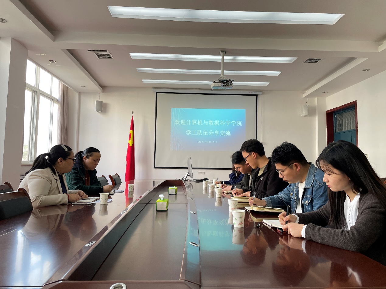 (通讯员 吴雨泽)为进一步加强辅导员队伍建设,更好的做好员工教育管理服务工作,4月15日上午,计算机公司党委副书记张星、团总支副书记、学工办副主任王占洲及公司专职辅导员一行四人来公司就员工工作进行分享交流。分享会在二号教学楼B313举行,公司党委副书记宁蕴绯、团总支副书记、学工办副主任徐娟、陈伟及辅导员吴雨泽参加了会议。