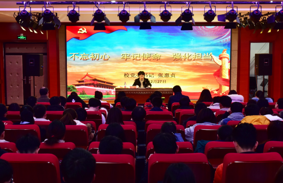 张惠贞以回顾党的伟大历史,深刻认识和理解初心使命的时代内涵为切入,指出中国共产党始终坚持以人民为中心,始终把为人民谋幸福作为初心,让人民群众不断有切切实实的获得感幸福感安全感,赢得了民心。随后她从世界科技文化发展的严峻挑战、超级大国单边主义的严峻挑战、新旧贸易保护主义的严峻挑战和敌对势力西化分化的严峻挑战四个方面分析了当今中国面临的重重挑战。她勉励同学们认真学习科学文化知识,提高自身创新意识,为祖国的发展贡献自己的力量。她强调新时代老员工要以理想信念引领历史使命,要以创新精神诠释责任担当。希望各位同学们在接下来的学习、工作中,不忘初心、牢记使命,为中华民族真正的伟大复兴贡献力量,实现个人价值。