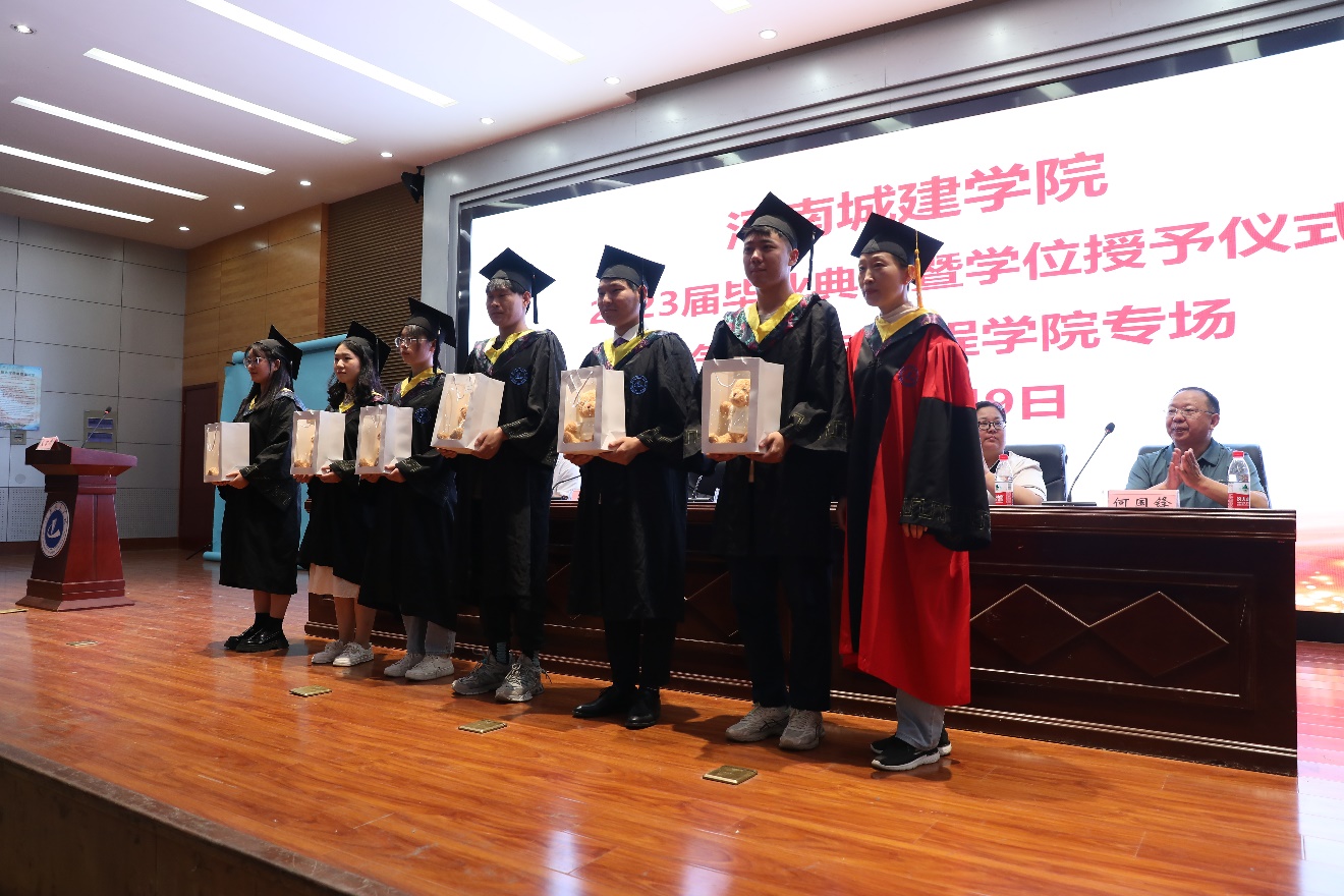 典礼在庄严雄壮的国歌声中拉开帷幕。公司领导分别宣读了校级优秀毕业生、公司2023届优秀毕业设计(论文)的表彰决定、2023年度国家员工体育健康测试优秀获得者名单以及授予毕业生学士学位的决定,同时对获得校级优秀毕业生、公司2023届优秀毕业设计(论文)作者、2023年度国家员工体育健康测试优秀获得者进行了表彰。随后,副董事长吴晓红、经理董燕飞共同为毕业生正冠拨苏、颁发学位证书并合影留念。