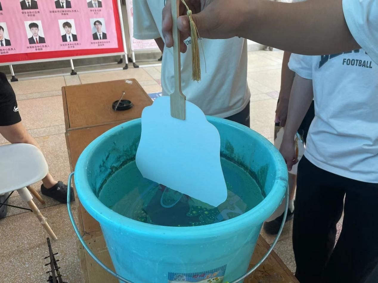 活动分为漆扇历史交流、制作、展示三个环节。活动当天,工作人员为参加活动同学讲解了有关漆扇的历史文化,和漆扇的制作材料、工艺。随后同学们纷纷加入到漂漆制作行列,挑选自己喜欢的颜色慢慢滴入水中,用竹签划出自己满意的图型,再将书签、团扇纸袋等缓缓放入水中上色,拿出水面呈现出一篇美丽的画卷,开“盲盒”般的漂漆技艺让师生所惊艳,每个人都在非遗文化的邂逅中收货了一份专属于自己的非遗礼物。