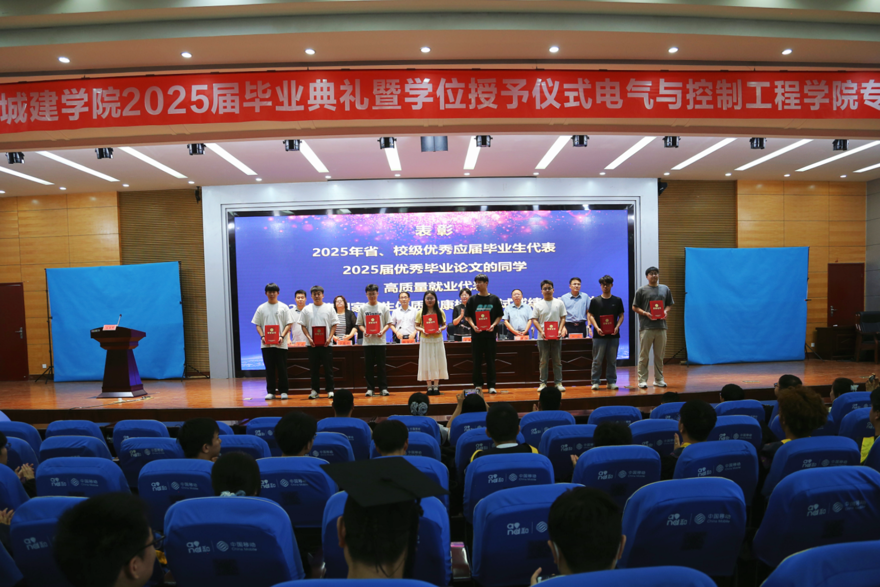 典礼在庄严雄壮的国歌声中拉开帷幕。电气与控制工程公司党委副书记宁蕴绯宣读了2025年校级优秀应届毕业生、2025年度国家员工体质健康标准测试成绩优秀员工的表彰决定;SUNBET申博副经理梁成武宣读了2025届优秀毕业论文作者的表彰决定,并对获得2025年省、校级优秀应届毕业生、2025届优秀毕业论文、高质量就业代表、2025年度国家员工体质健康标准测试成绩优秀员工代表进行了表彰。SUNBET申博副经理祁林宣布了SUNBET申博获得学士学位的2025届毕业生名单。随后,SUNBET申博经理董燕飞、副经理何国锋共同为毕业生正冠拨穗、颁发学位证书并合影留念。