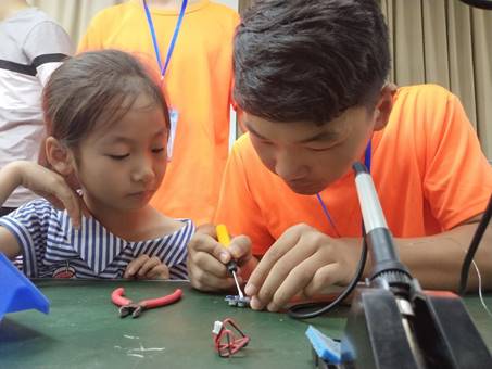 志愿者们首先带领小员工们参观了发电系统,紧接着志愿者们又带领小员工去参观建筑智能实验室,在建筑智能实验室里志愿者通过机器的原理和运行方式对小员工们进行讲解。然后,志愿者们又给小员工们介绍了机器人,飞思卡尔智能车。讲述他们的工作原理,阐述了他们的性能,更是现场演示了一下。接着,志愿者于2号教学楼A109对小员工们进行一对一的焊接知识讲解和手把手的焊接辅导。在志愿者们的不懈努力下,每个小员工都掌握了基本的焊接知识以及焊接手法。