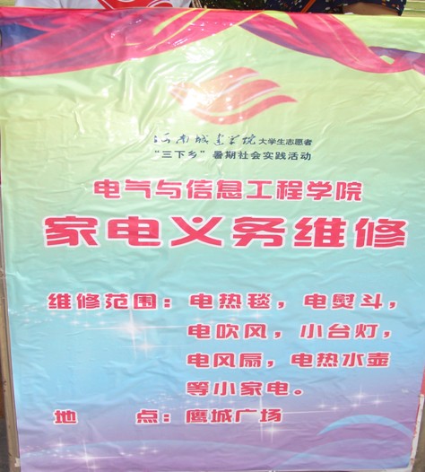 此次实践活动在院领导的精心筹备及员工们的充分准备下开展的。义务家电维修活动得到了市民的好评,也引起了记者的关心。在活动开展过程中,《平顶山晚报》记者团就来到了我们的活动现场,对参与家电维修同学进行了一一的采访。记者对我们此次的活动给予了高度的评价,并鼓励我们以后可以多多举行这些义务活动,增加同学们的课外知识,真正做到理论联系实际,将我们所学的知识应用于实际,为社会,为他人服务。博物馆义务讲解服务队深入博物馆,为市民进行讲解,在增加了自己知识的同时,也服务了市民,受到了市民的一致好评。其他两支队伍的同学也在各自的实践过程中丰富了知识,提高了自己的实践能力。